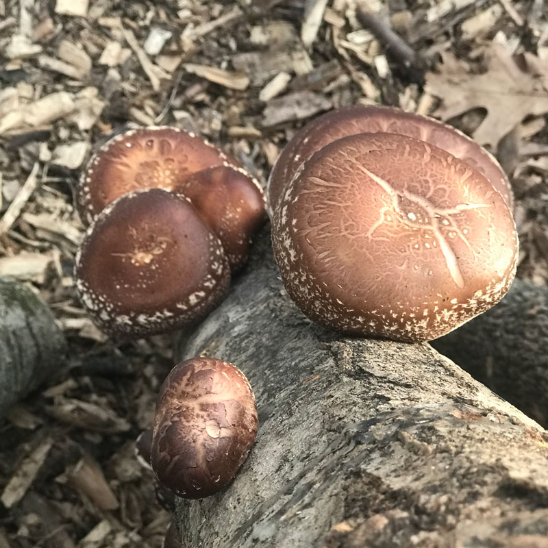 Each year we harvest damaged trees in the forest, thinning the stand to leave room for healthy trees to flourish in the forest. These trees are used to grow shiitake mushrooms, speeding the decomposition of the cut tree, helping to return it to soil in the forest.